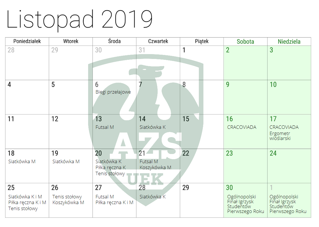 20 meczów w dyscyplinach drużynowych, 2 starty w dyscyplinach indywidualnych, 6 hal sportowych, dziesiątki studentów i studentek reprezentujących AZS UEK w listopadzie. Pełną parą wchodzimy w sezon 2019/20 AMM. Zapraszamy wszystkich sympatyków sportu akademickiego na halę UEK, gdzie rozegra się większość meczów naszych klubowych drużyn. Na stronie Organizacji Środowiskowej AZS Kraków znajdują się szczegółowe terminarze wraz z godzinami meczów, miejscem oraz drużynami, z którymi będziemy walczyć o tytuł Akademickiego Mistrza Małopolski.